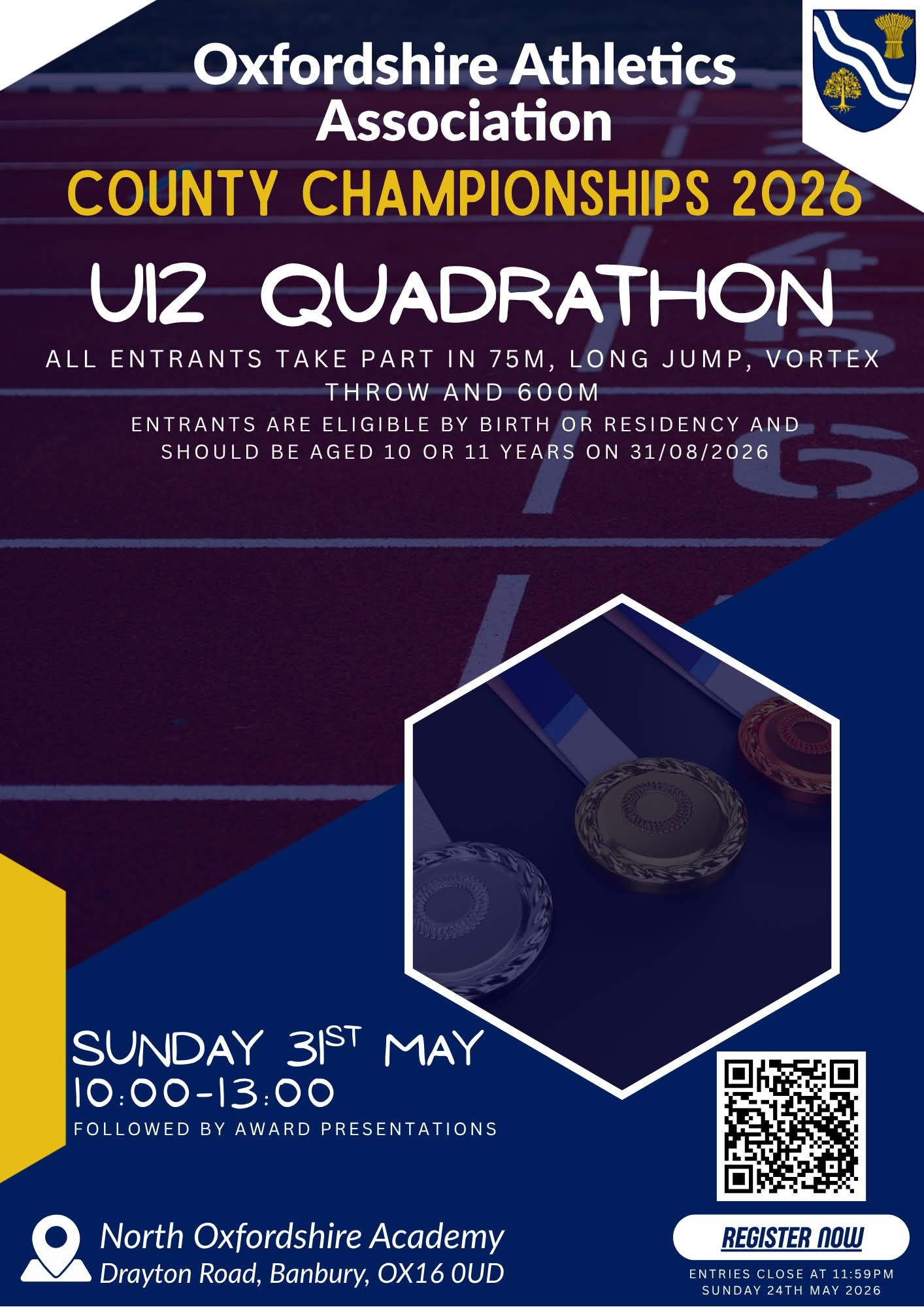 Submitted by Alan Vincent on Thu, 23/04/2026 - 10:47 Updated version of flyer for County Championships U12 Quadrathon Attachments WhatsApp Image 2026-04-22 at 13.27.10.jpeg